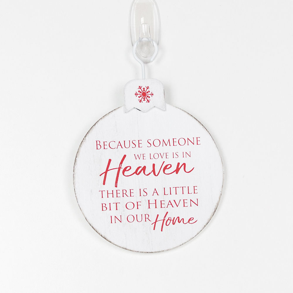 Radiate a holiday feel in the air this December with this attractive wood ornament (Product Number 70488)! It comes with white and red colors and a cute Christmas ball shape that adds a holiday spark onto a plain wall. It reads "Because Someone We Love Is In Heaven There Is A Little Bit Of Heaven In Our Home", ideal for those who're missing their loved ones this holiday. It has dimensions of 5" by 5" by .5" and can also be used in decorating offices, restaurants, and more. Designing home and holiday decors for over 8 years, Adams & Co has shown the world its unique style and conventional flair that can bring you any theme that you want to achieve. From seasonal decorations to traditional ornaments, we have everything you need to add life to your home or office.